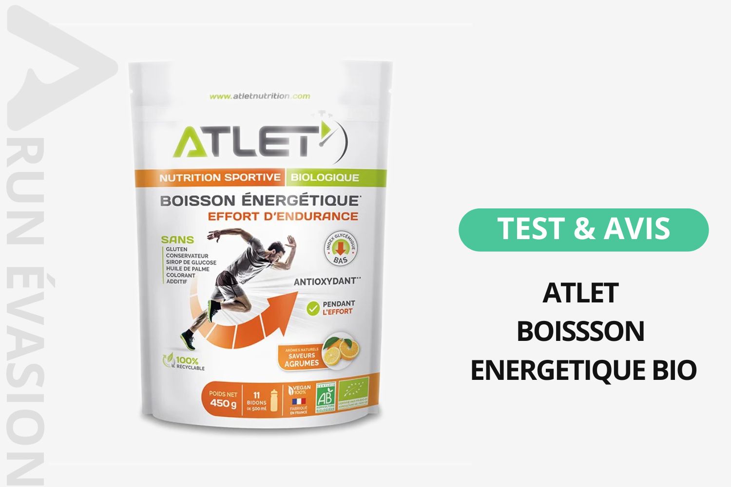 ATLET est une marque du groupe Nutrition Concept, basé en France, spécialisée dans la nutrition sportive naturelle. La boisson énergétique bio s’inscrit dans une gamme pensée pour les sportifs d’endurance refusant les additifs chimiques, avec un positionnement clairement défini : efforts supérieurs à 1h30. Deux saveurs sont disponibles (agrumes et menthe), un seul format existe actuellement (le sachet de 450 g en poudre à reconstituer), et l’usage recommandé est précis – trail, marathon, cyclisme longue distance, triathlon. Pas de version prête à boire, pas de pastilles, pas de sticks individuels pour l’instant.